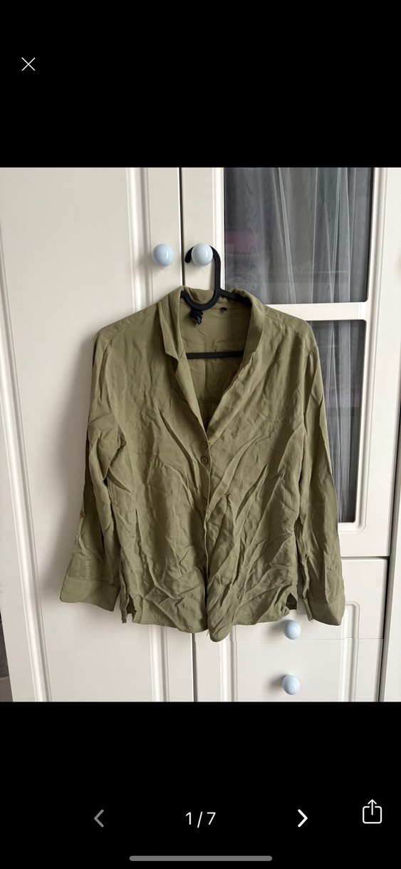Kadınlar için haki renkte, pamuklu kumaştan yapılmış, uzun kollu ve düğmeli, notlu yaka detaylı bol kesim gömlek. Günlük rahat kullanım için uygundur.
