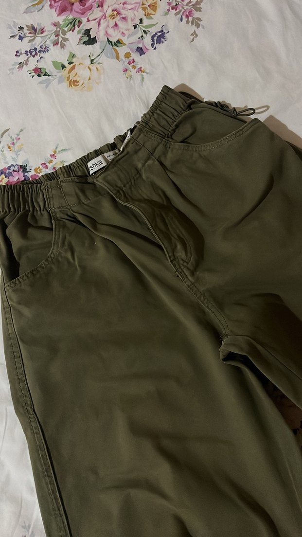 Kadınlar için haki renk, rahat kesim, normal midi boy pamuklu kumaştan yapılmış pantolon. Fermuarlı detaylar ve lastikli bel ile günlük bohem tarzda kullanıma uygundur.