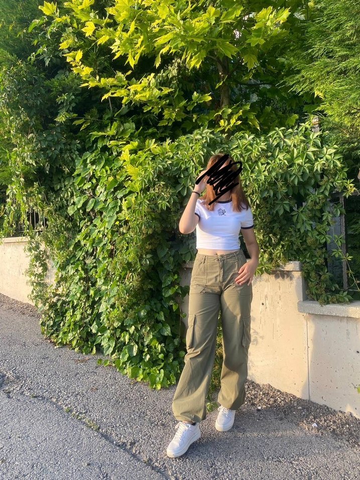 Haki pamuklu, midi boy salaş kadın pantolon. Rahat ve şık sokak stili görünümü sunar.