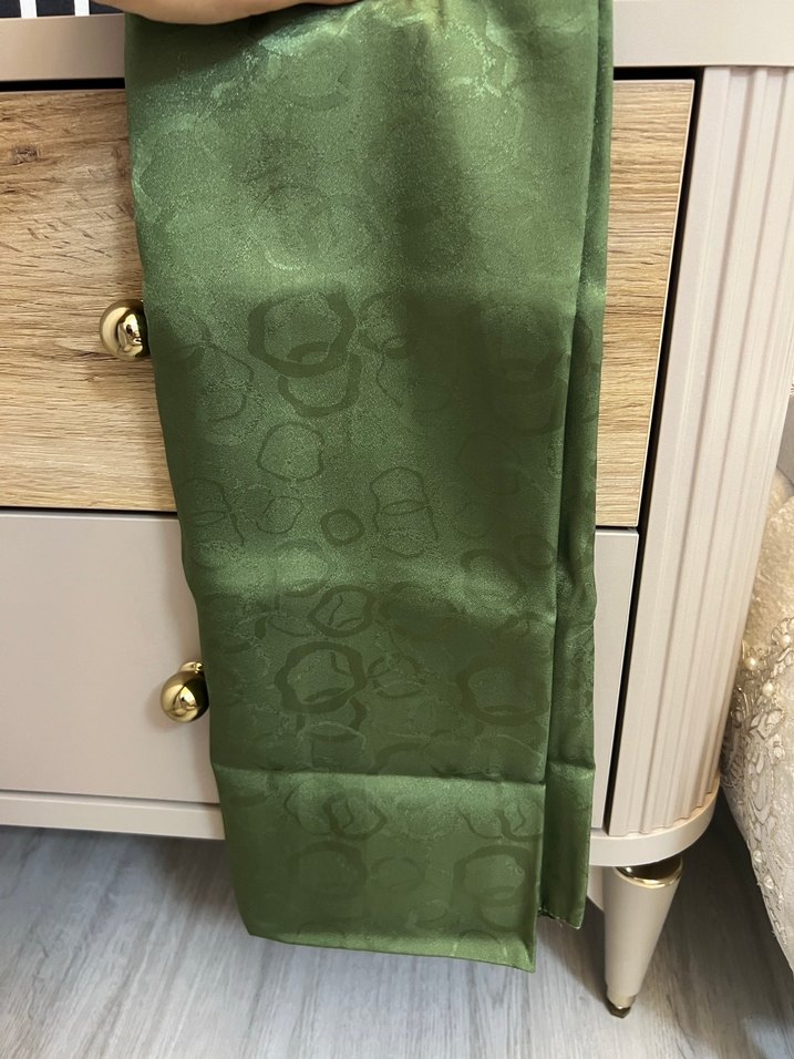 Kadınlar için saten dokulu, parlak haki renkte ve düğmeli detaylı şal. Sade ve rahat bir tarz sunar.