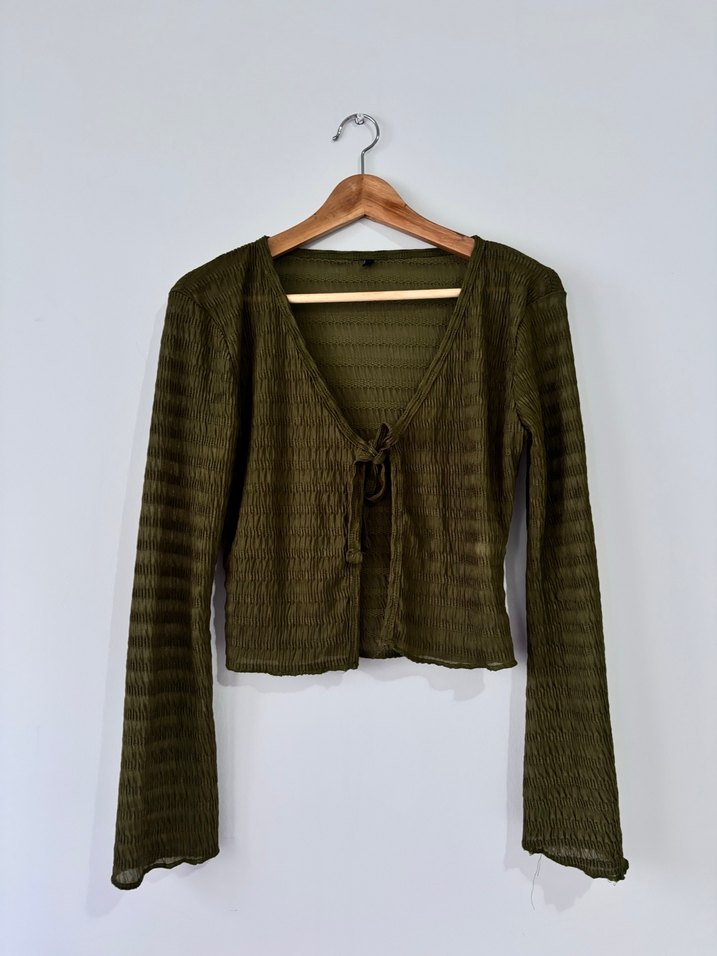 Pilili dokusu ve V yakasıyla bohem tarzda, uzun kollu ve keten kumaştan yapılmış, haki renkli, normal boyda ve dar kesim kadın bluz.