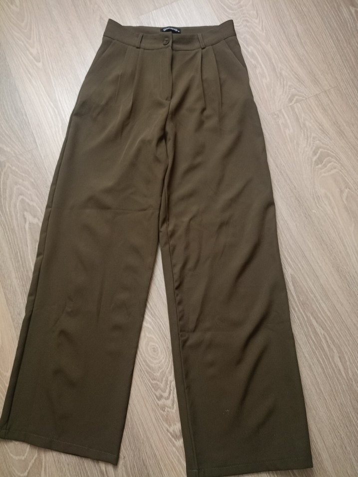 Kadınlar için haki renk, pilili ve midi boy kumaş pantolon. Ofis kullanımı için uygun, rahat sentetik kumaştan üretilmiştir. sorunsuz