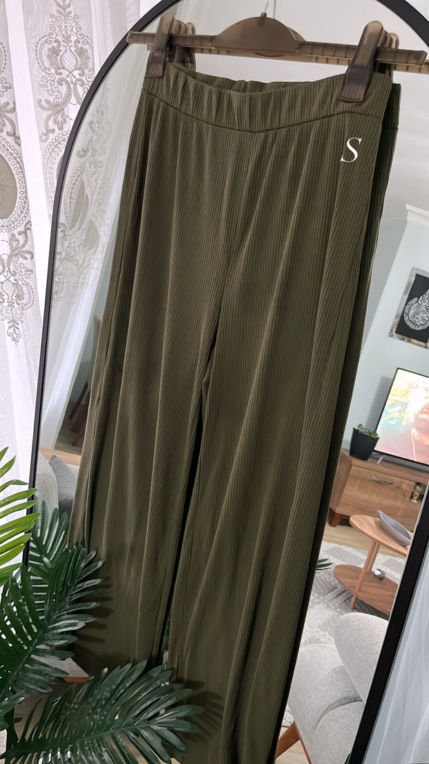 Kadın haki renk pilili, bol kesim, yumuşak sentetik kumaştan yapılmış rahat pantolon. Günlük ve rahat sokak stili için uygundur.