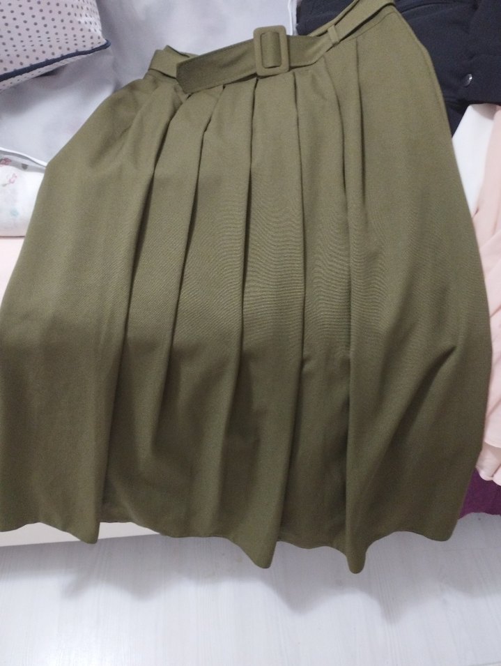 Haki renk, piliseli ve bol kesim midi etek. Parlak sentetik kumaştan üretilmiş olup, kemer detayına sahiptir. Günlük kullanıma uygundur.