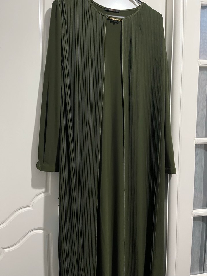 Kadın haki renkli uzun kollu elbise, sentetik kumaştan, piliseli ve bol kesimdir. Minimalist ve çağdaş tarzıyla ofis için uygundur.