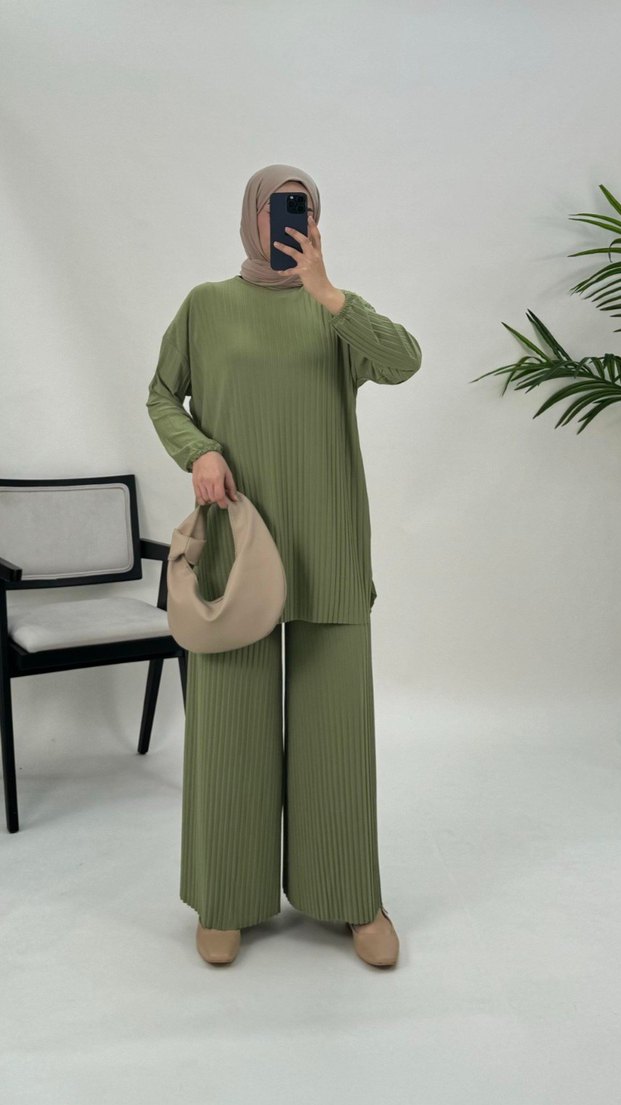 Kadınlar için pastel haki renkte, pliseli dokulu uzun kollu, salaş kesim ve bisiklet yaka takımdır. Yumuşak kumaştan üretilmiştir. s m l xl uyumlu marka temsili butik ürünü