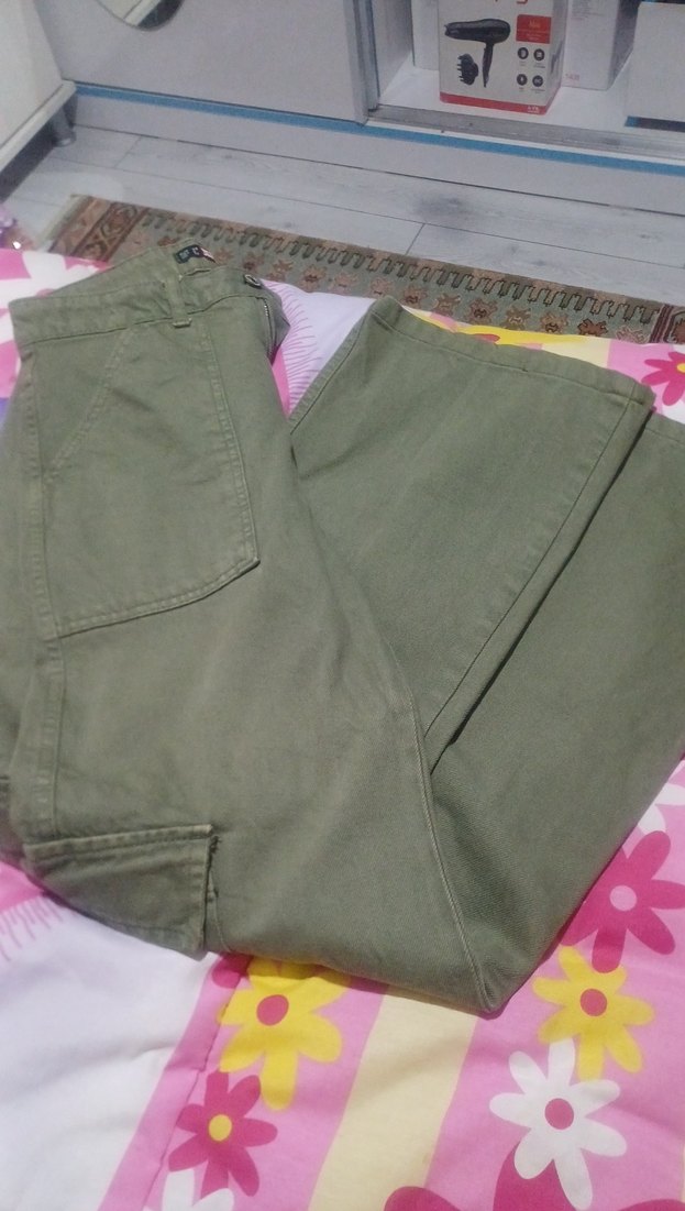 Kadınlar için haki renk, pamuklu kumaştan yapılmış, rahat kesim ve normal midi boyda fermuarlı pantolon. Günlük kullanıma uygundur.
