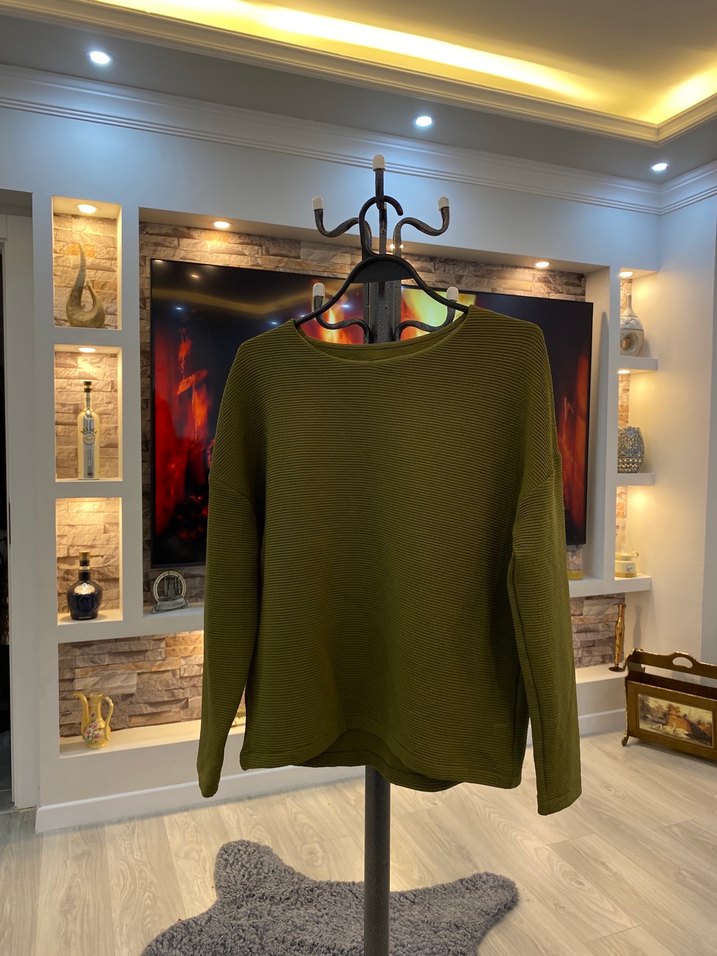 Kadınlar için haki renkli, yuvarlak yakalı ve uzun kollu, rahat kesim midi uzunlukta sweatshirt. Yumuşak ve sıcak kumaştan, desen içermeyen sade tasarım, günlük sokak stili için uygun.