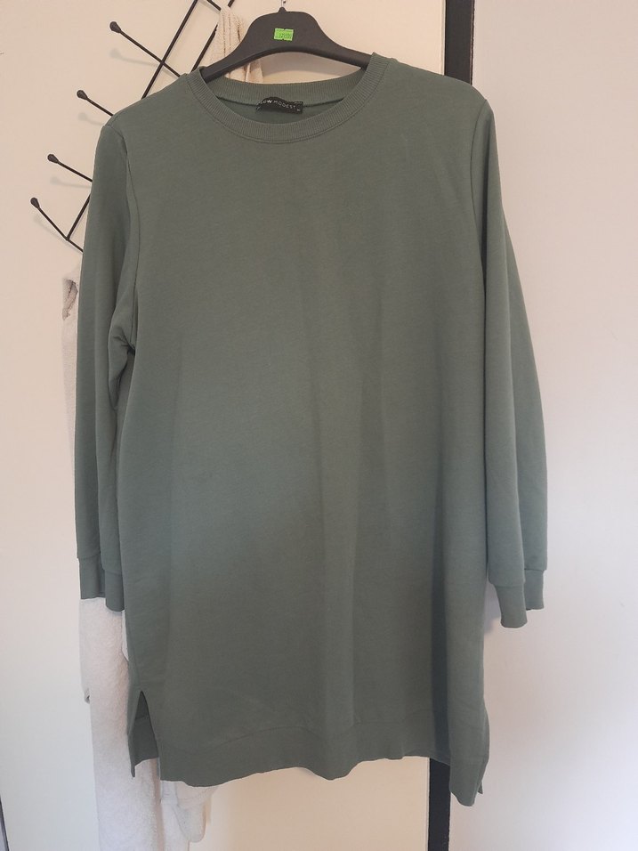 Kadın tunik, yuvarlak yaka ve uzun kollu olup rahat kesim ve midi boydadır. Yumuşak sentetik kumaştan üretilmiş, gündelik kullanıma uygun haki renkte sade bir tasarıma sahiptir.