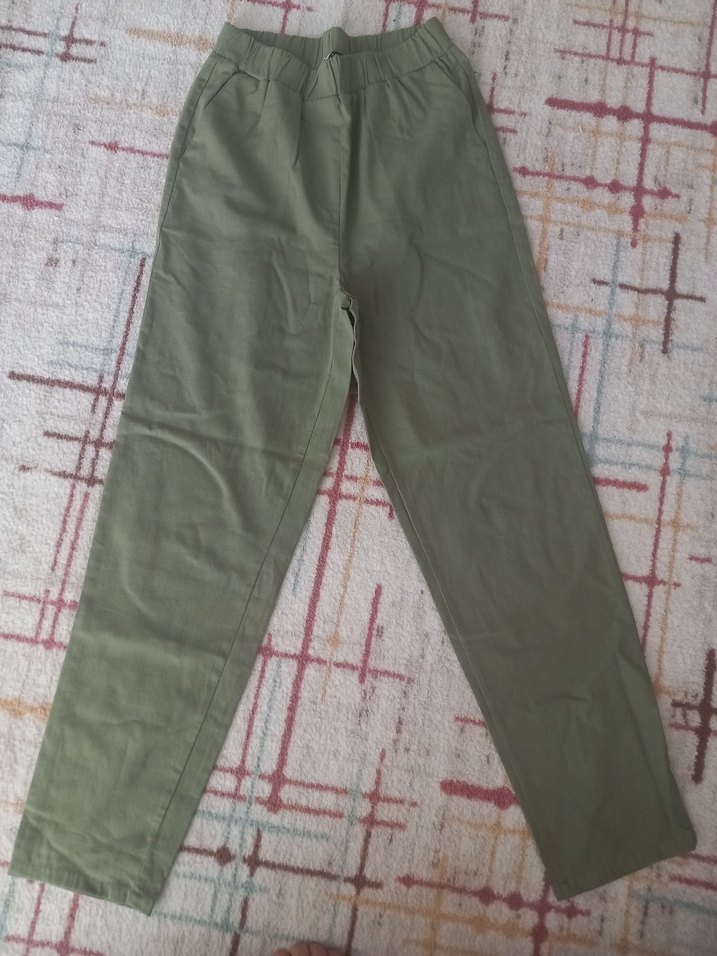 Kadınlar için haki renk, regular keten kumaştan yapılmış, günlük kullanıma uygun rahat ve şık bir pantolon.