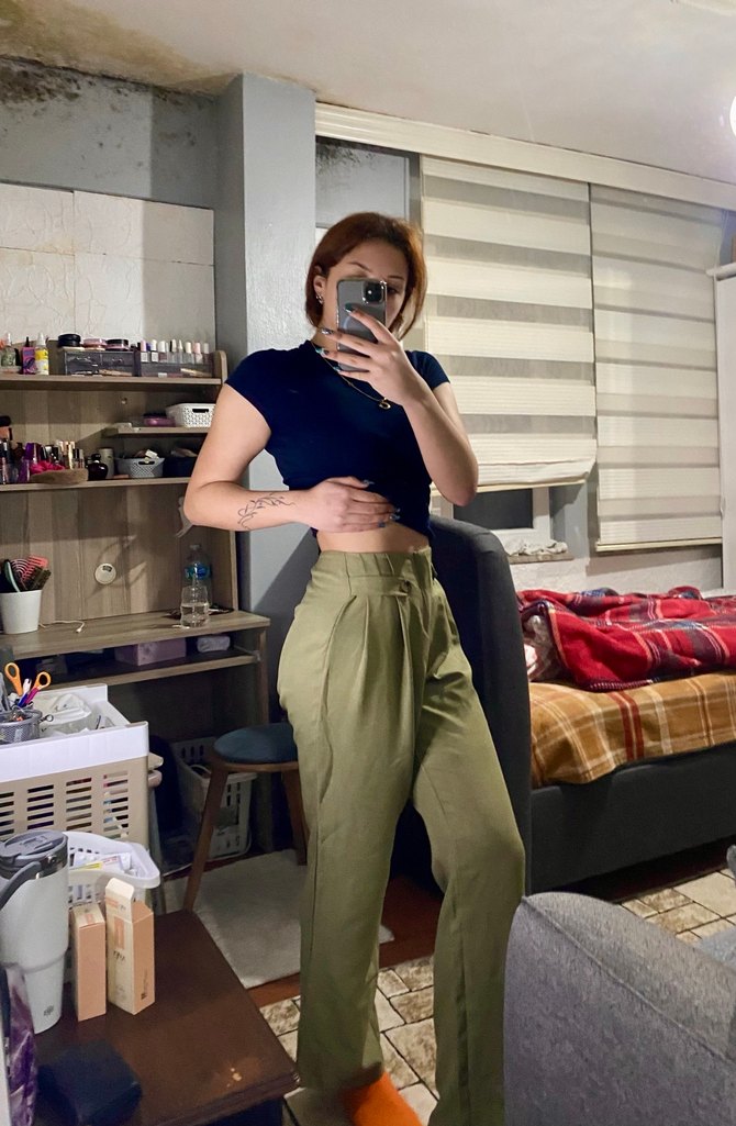 Kadınlar için haki renk regular fit, midi boyfriend pantolon. Düz, koyu renkte ve yumuşak sentetik kumaştan, rahat ve şık bir görünüm sunar. Ofis ve günlük kullanıma uygundur.