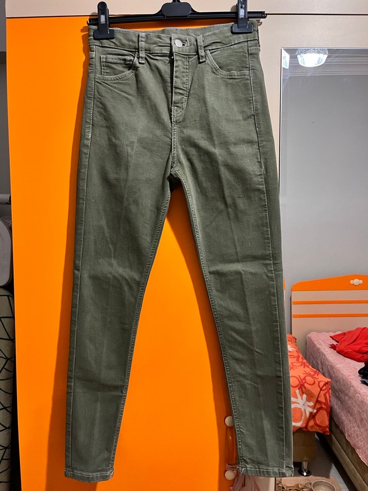 Kadınlar için haki renk, kemerli, normal boy, regular fit denim pantolon. Esnek olduğundan 30 beden de rahatlıkla olur. Dar paçadır. Herhangi bir hasarı yoktur, temizdir. Beden uyuşmazlığından satıyorum.