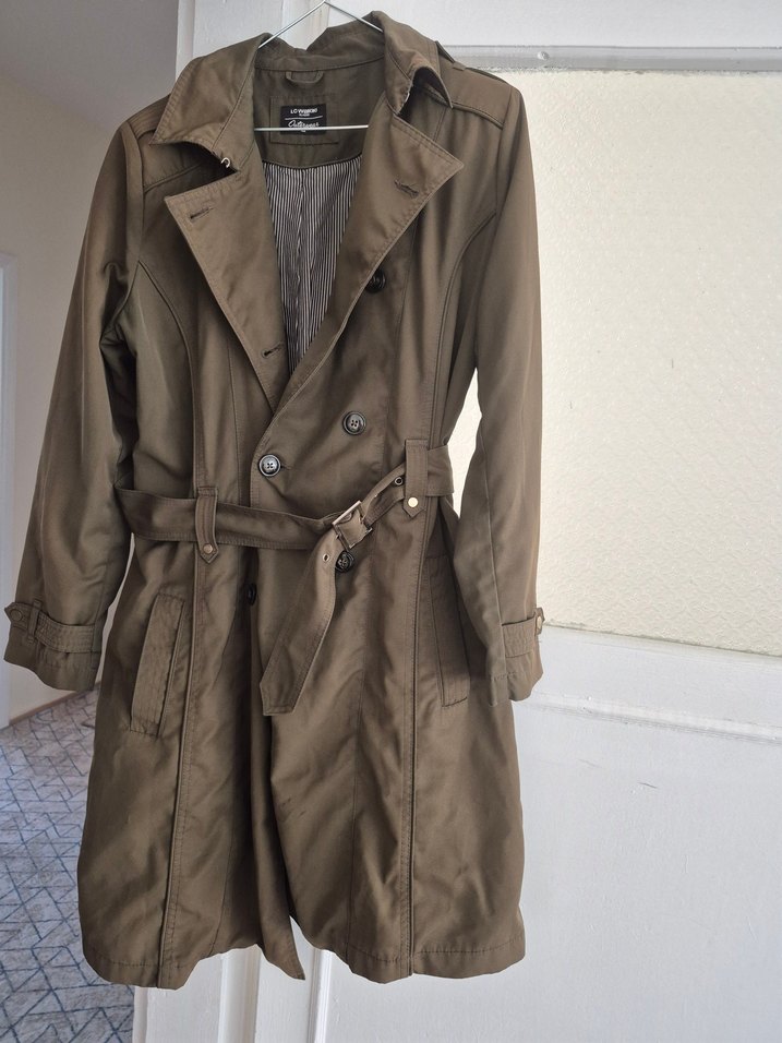 haki renk kadın trençkot, kemerli, yakalı ve askılı kollu. Gevşek kesim, sentetik kumaş, günlük sokak stili için uygun. Ürün sağlam sadece renginde hafif solma var.