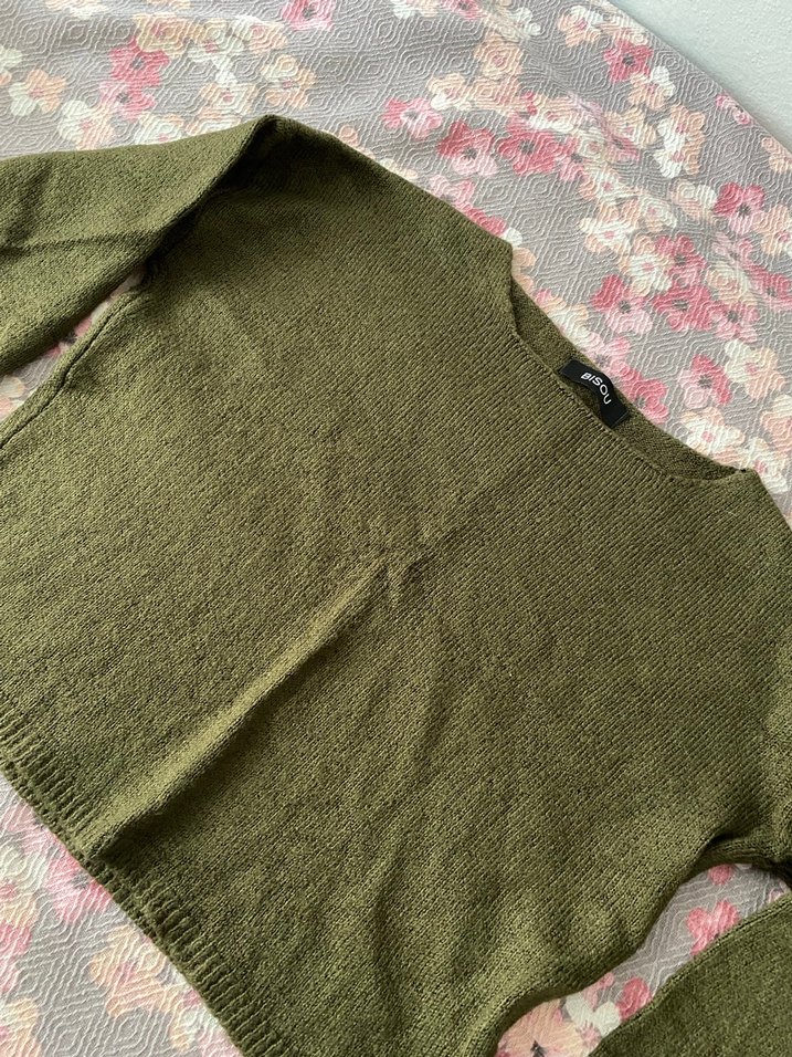 Kadınlar için haki renk, örgü kumaştan, uzun kollu, yuvarlak yakalı, salaş kesim kazak. Günlük kullanım için uygundur.
