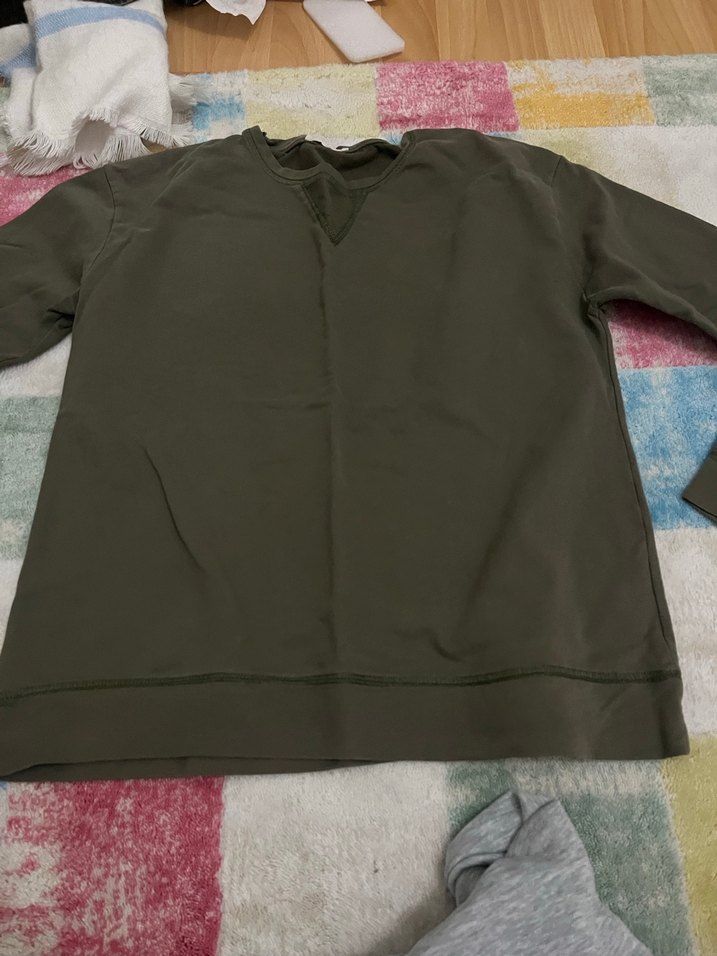 Kadınlar için yuvarlak yaka, uzun kollu ve salaş kesime sahip haki renk sweatshirt. Yumuşak sentetik kumaştan, sade ve gündelik tarz için uygun.
