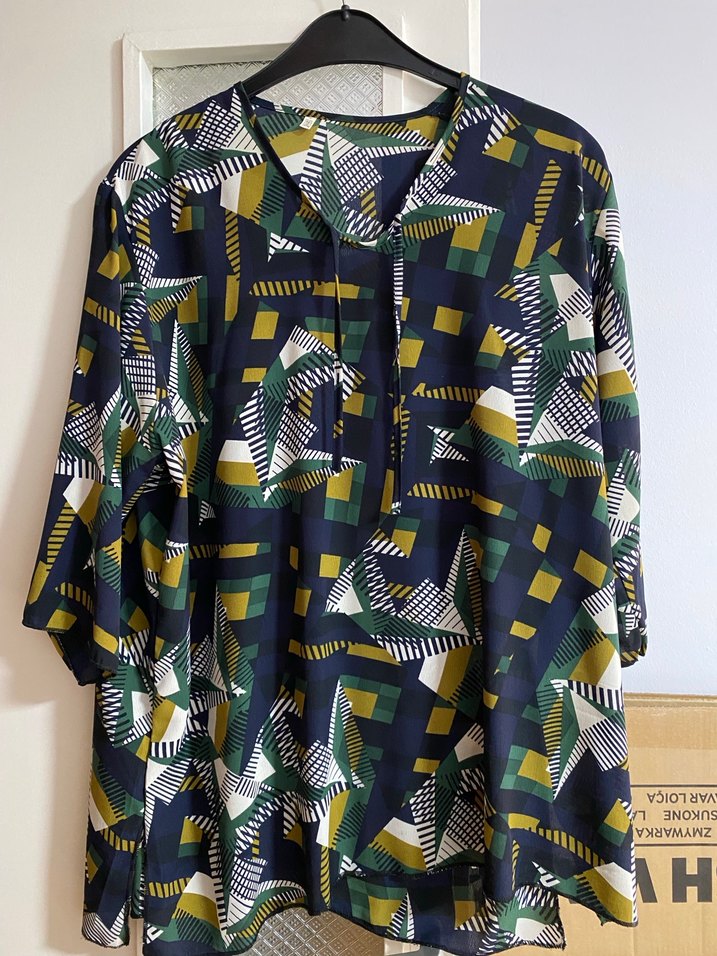 Kadınlar için sentetik kumaştan, bol kesim, pile detaylı, V yaka, kısa kollu, midi boy, koyu haki renkli geometrik desenli bluz. ✨