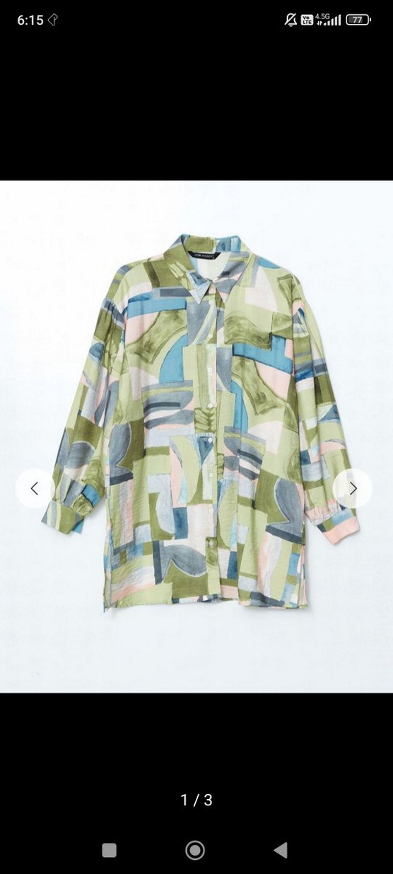 Kadın haki renkli gömlek, uzun kollu ve düğmeli, bol kesimdir.