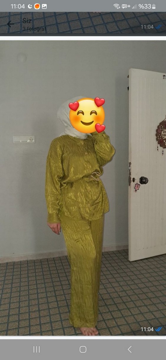 Kadın haki keten salaş takım, yüksek yakalı ve uzun kollu. Midi boy, parlak batik desenli ve drapeli, günlük kullanım için uygun.
