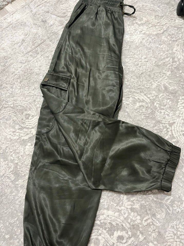 Kadınlar için bol kesim, saten kumaştan yapılmış haki renkte kemerli pantolon. Sokak tarzı, normal midi boy ve parlak görünümlü, rahat ve şık bir seçenek. ✨