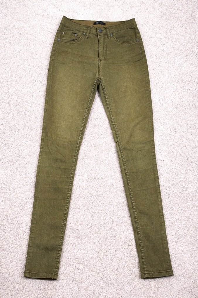 Haki renkte, parlak görünümlü, slim fit denim pantolon. Normal midi boyda, sade ve rahat günlük kullanıma uygun.