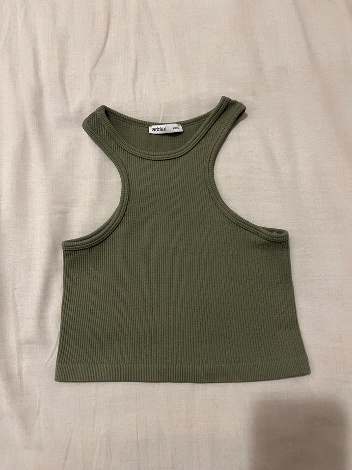 Haki renk, askısız ve koltuksuz, vücuda oturan kesimde, yumuşak sentetik kumaştan üretilmiş kadın spor atlet. Günlük kullanıma uygun sokak tarzı. ♀️