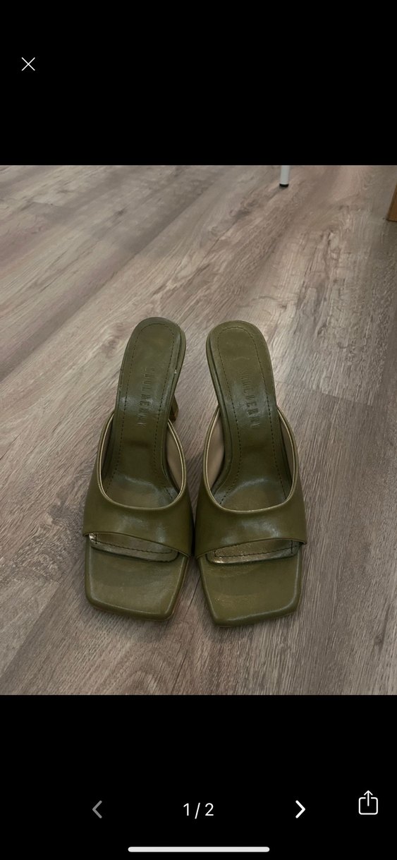 Kadınlar için parlak haki renkte, stiletto topuklu ve tokalı tasarıma sahip terlikler. Kauçuk malzemeden, modern klasik tarzda, günlük kullanım için uygun.
