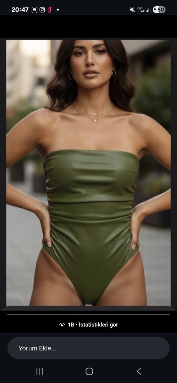 Haki renkte, straplez ve vücuda oturan kadın mayo. Minimalist ve şık tasarımıyla parti stiline uyum sağlar. Midi boyu ile rahat ve zarif bir görünüm sunar.