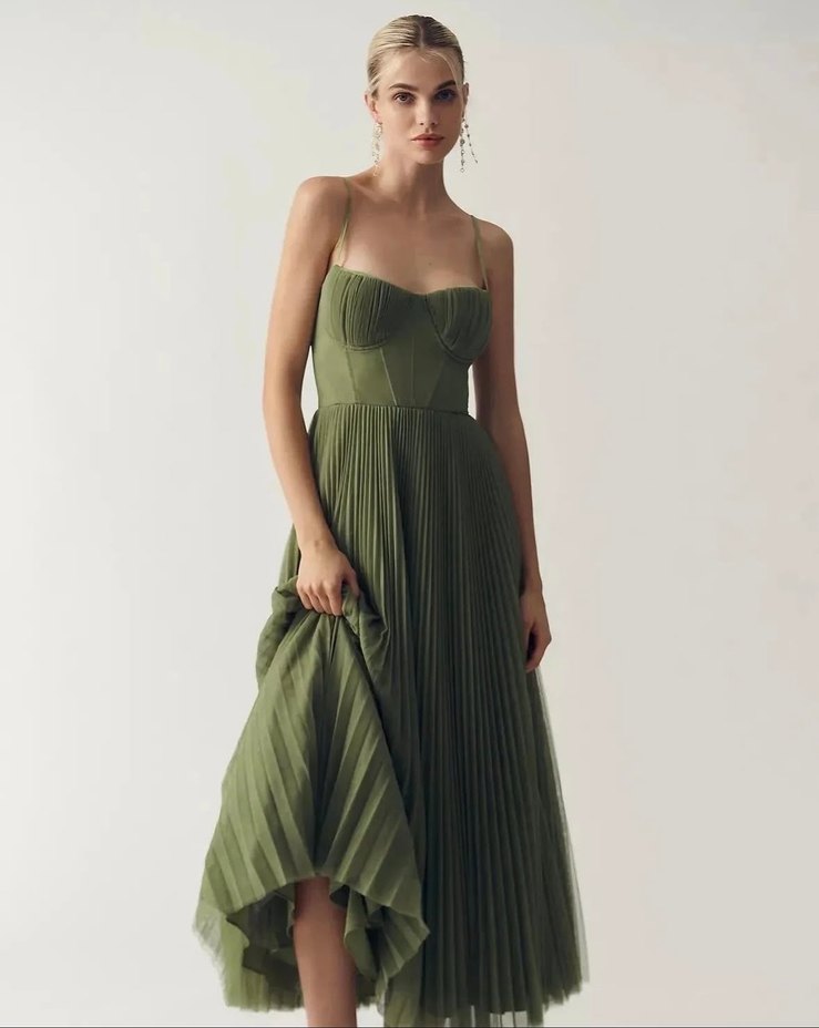 Kadın haki renkli, straplez yaka ve ince askılı, pilili etekli uzun elbise. Sentetik, yumuşak kumaştan, klasik modern tarzda, düğün için uygun.