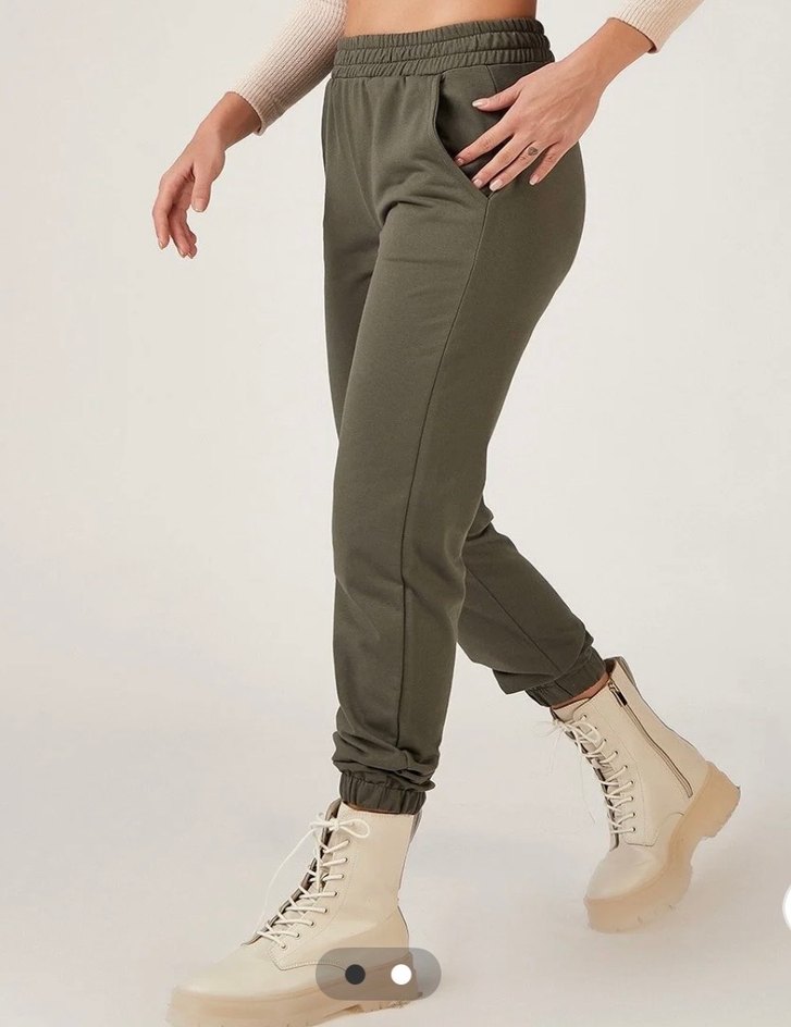 Kadınlar için haki renkte, süet dokulu, bol kesim ve midi boy eşofman altı. Elastik bel ve manşetleriyle günlük rahat şıklık sunar. ️