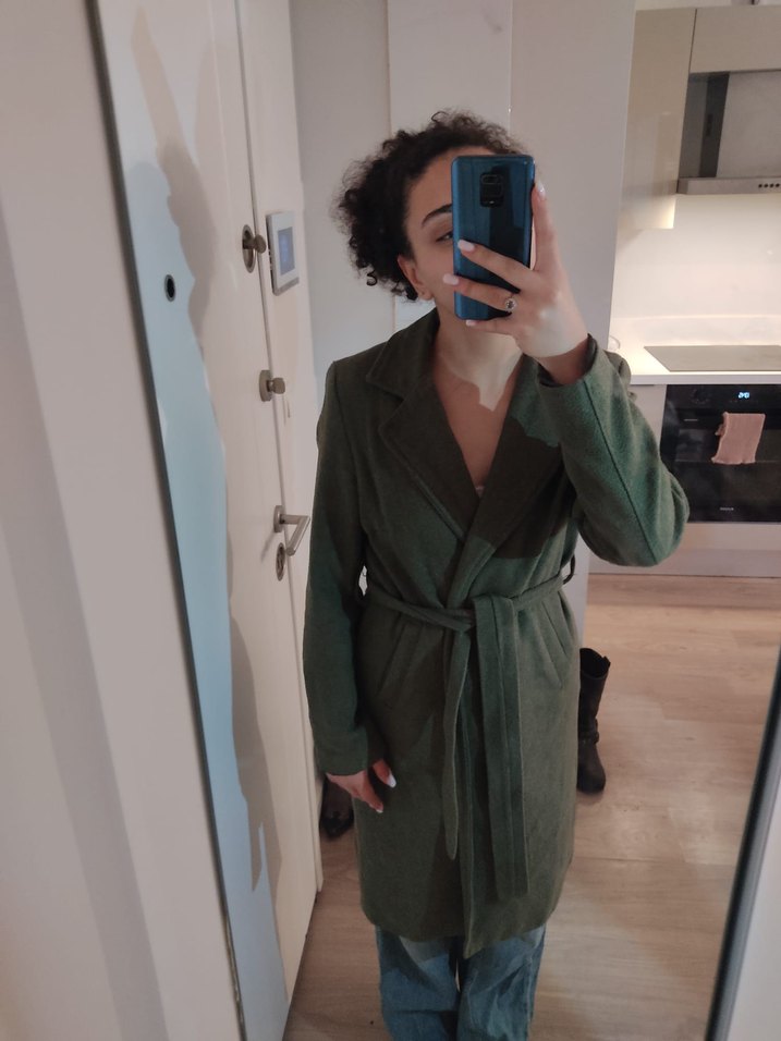 Kadınlar için haki renkte, yumuşak süetten yapılmış, kemerli ve normal kesim midi boy kaban. Uzun kollu ve yakası kesik detaylı, günlük kullanıma uygun. Toplu alımlarda indirim yaparım