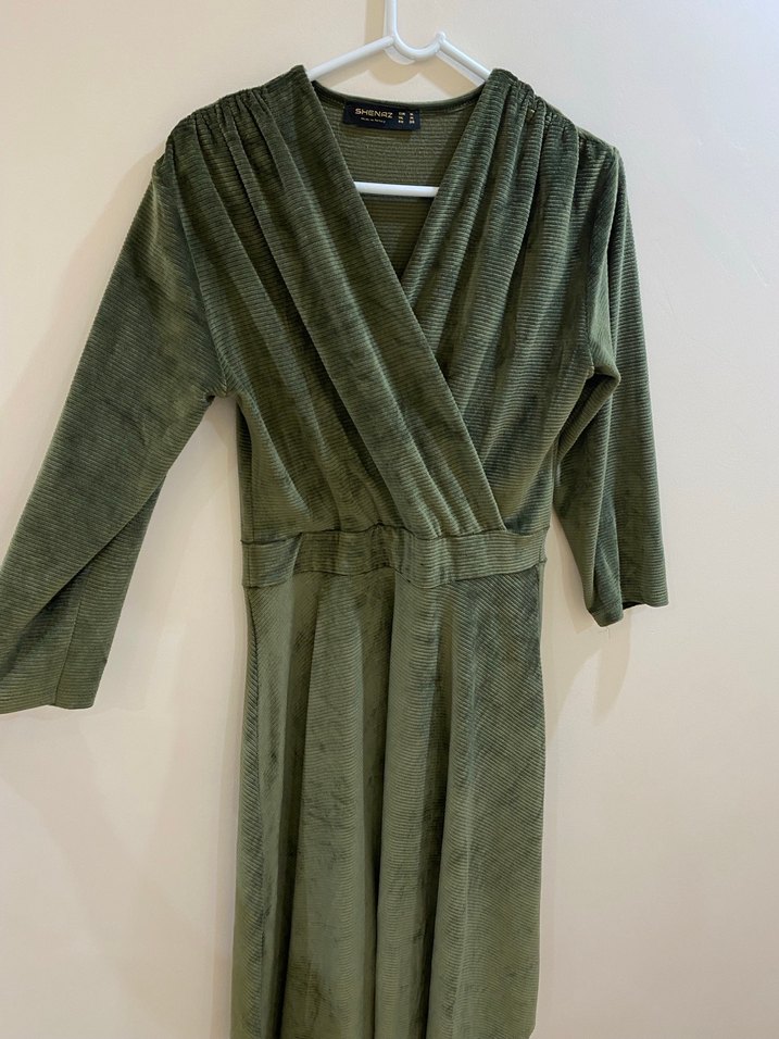 Kadınlar için haki renkte, süet kumaştan, v yaka ve uzun kollu, drapeli, bol kesim uzun elbise.