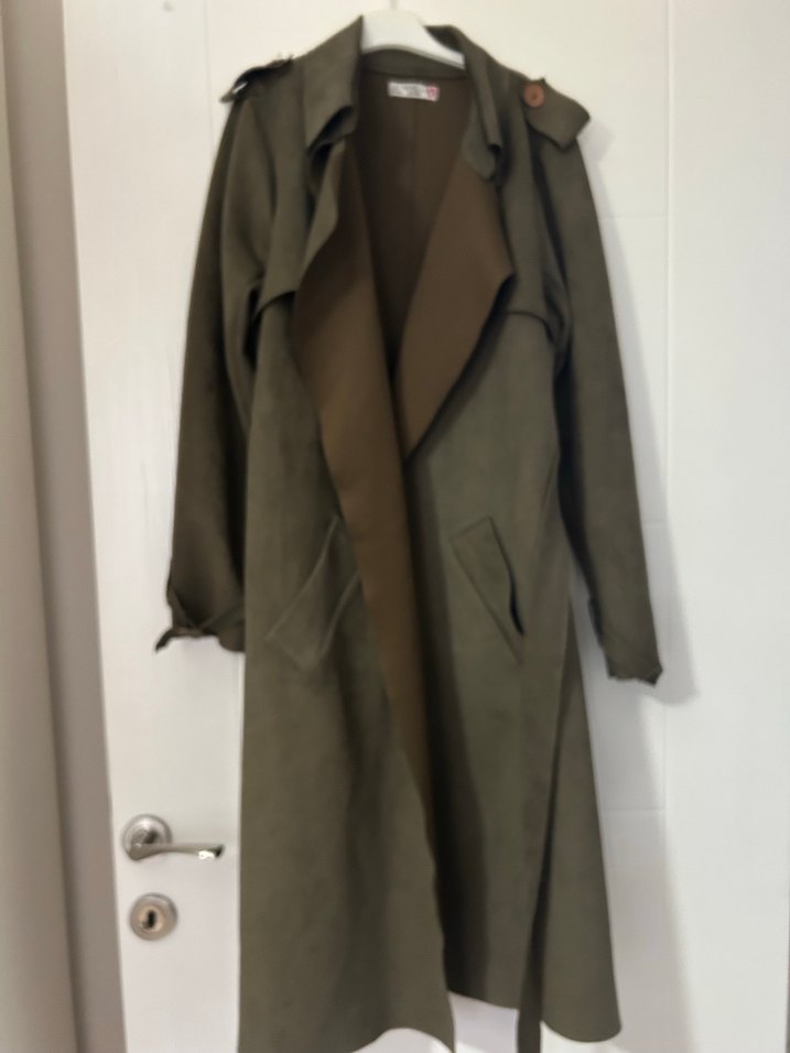 Kadınlar için haki renkte, süet kumaştan uzun trençkot. Notlu yaka ve kuşaklı bel ile bol kesim, uzun kollu günlük sokak tarzı için uygundur.