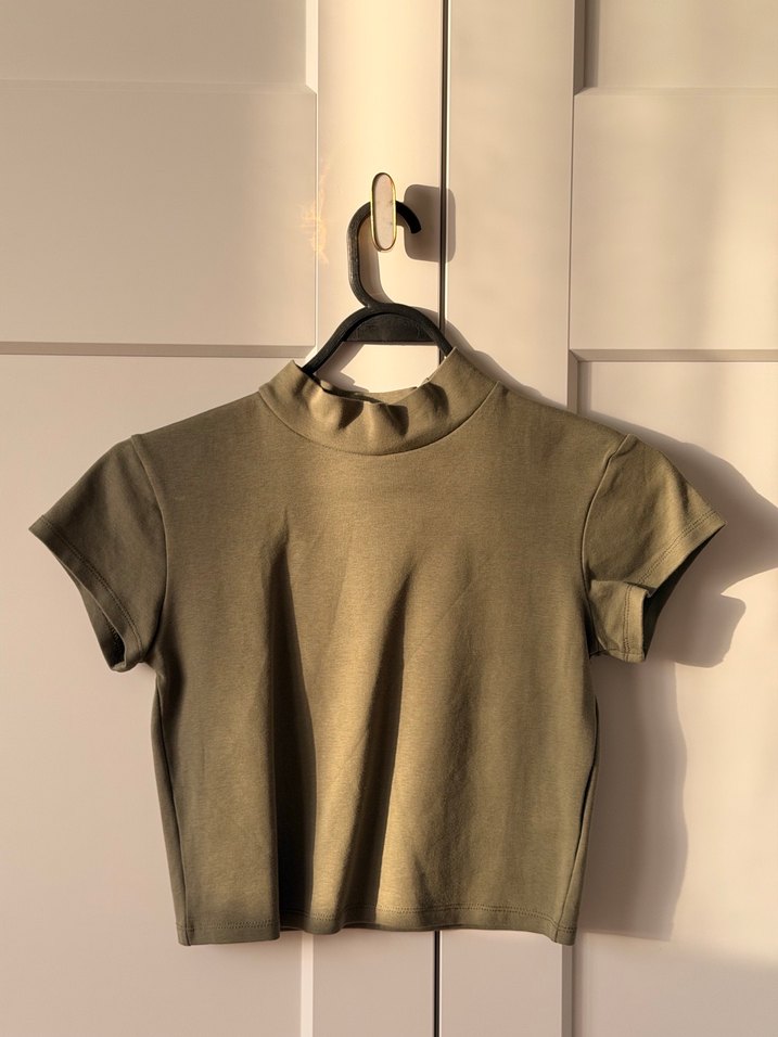 Kadın haki renk kısa kollu, yüksek yakalı süet tişört. Vücuda oturan kesimi ve desen içermeyen minimalist tasarımı ile günlük kullanıma uygundur. People by Fabrika.