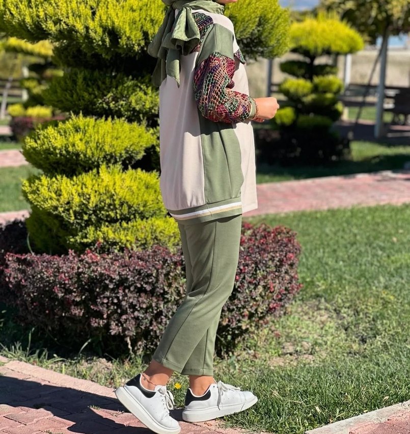 Salaş kesim, bel detaylı haki pantolon. Yumuşak sentetik kumaştan, batik desenli. Midi boy, günlük sokak stiline uygun.