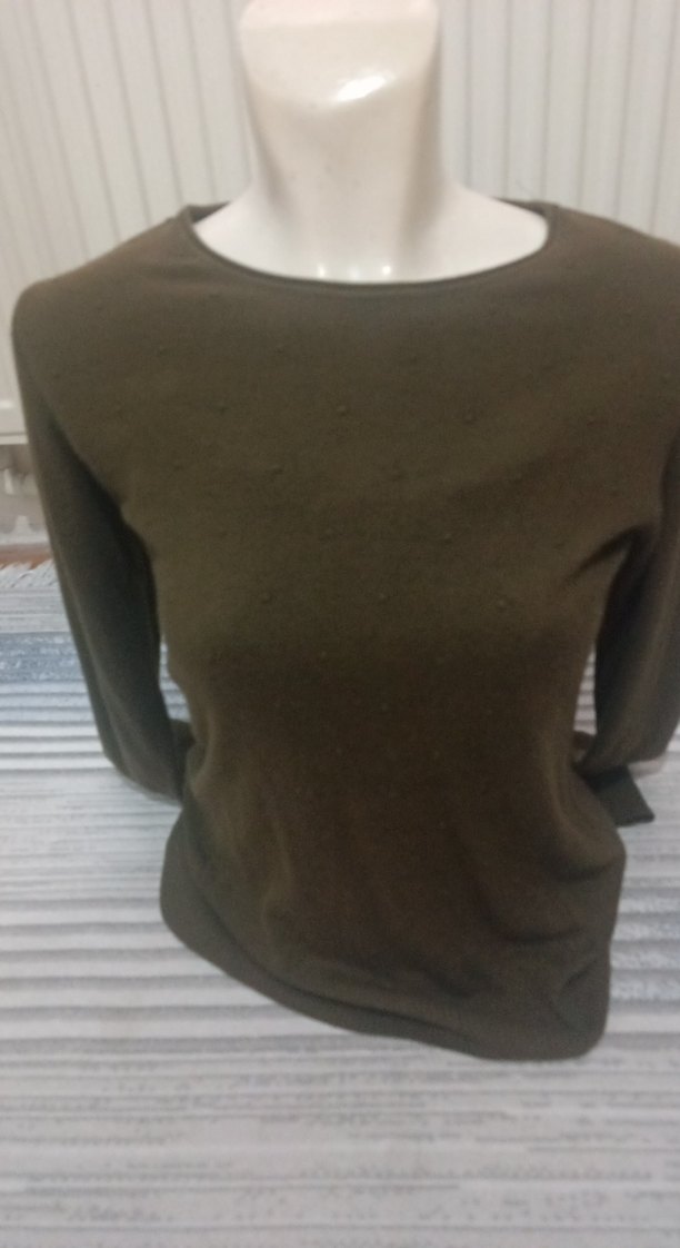 Kadınlar için bisiklet yaka, uzun kollu ve vücuda oturan haki triko kazak. Yumuşak sentetik kumaştan örülmüş, günlük kullanıma uygun.s m uyumludur