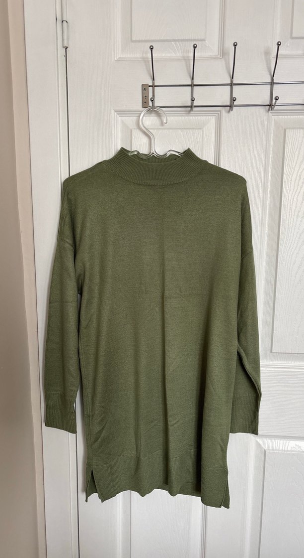Kadınlar için boğazlı, uzun kollu, bol kesim, haki renk triko kazak. Yumuşak keten kumaştan örülmüş, midi uzunlukta, sade ve rahat tasarım.