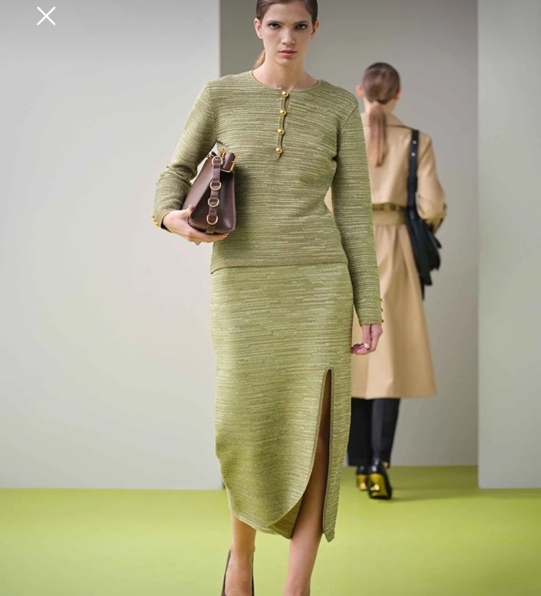 Haki renkli, uzun kollu, triko kumaştan yapılmış uzun boy etek. Regular kesim, yakası notched lapel ve önü yırtmaçlı, gündelik kullanıma uygun.