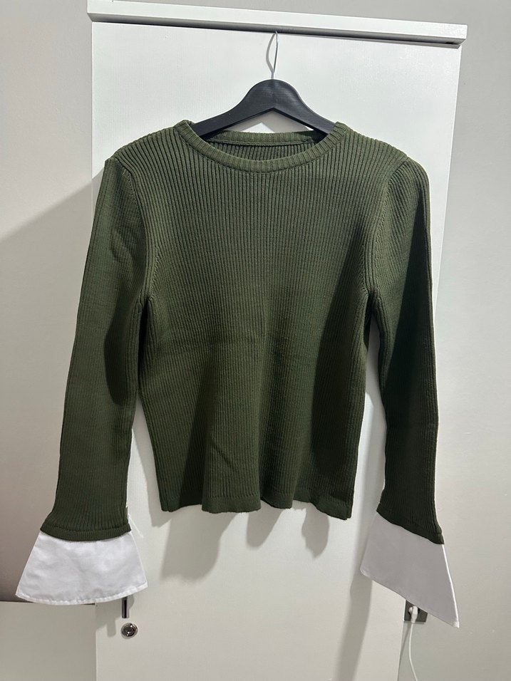 Kadın haki triko sweatshirt, uzun kollu ve yuvarlak yaka. Beyaz manşet detaylı, normal kesim, günlük rahat kullanıma uygun.