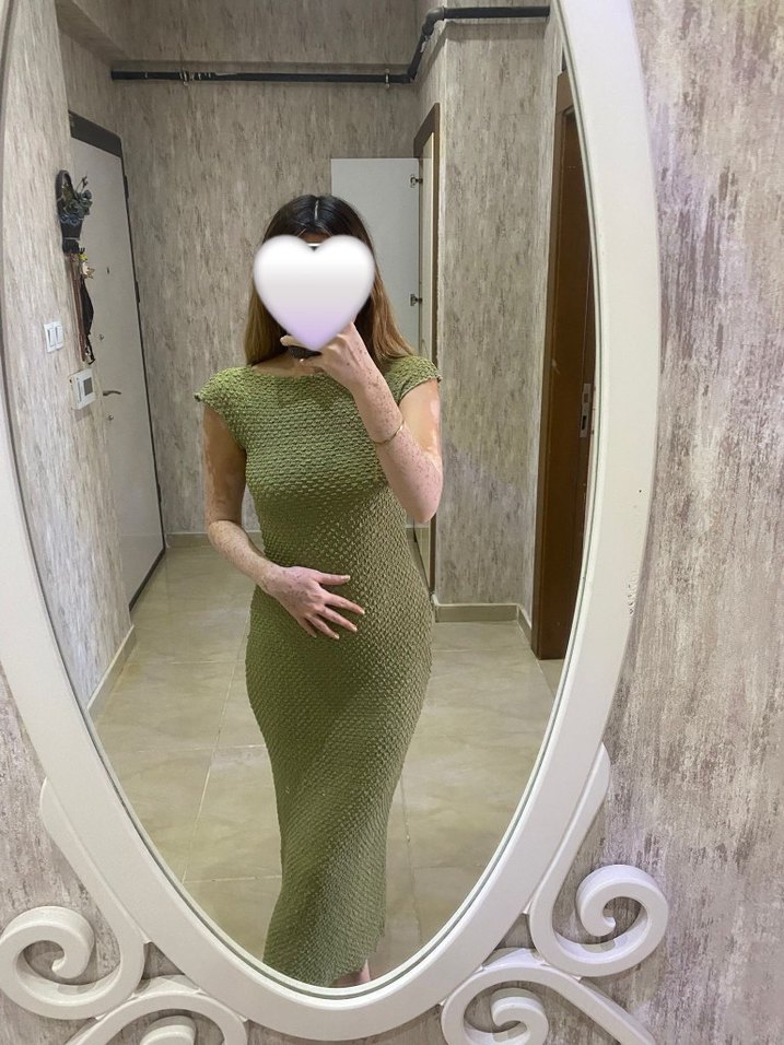 Kolsuz, haki triko uzun elbise, vücuda oturan kesim ve yuvarlak yaka ile minimalist normcore tarz sunar. Romantik akşamlar için uygundur.