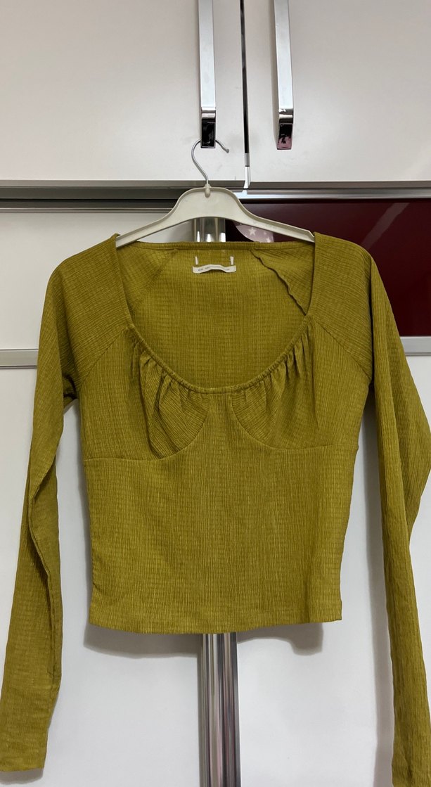 Fitted kesim, triko dokulu keten kumaştan yapılmış, haki parlak renkte, uzun kollu ve kayık yakalı kadın bluz. Günlük sokak stili için uygundur.