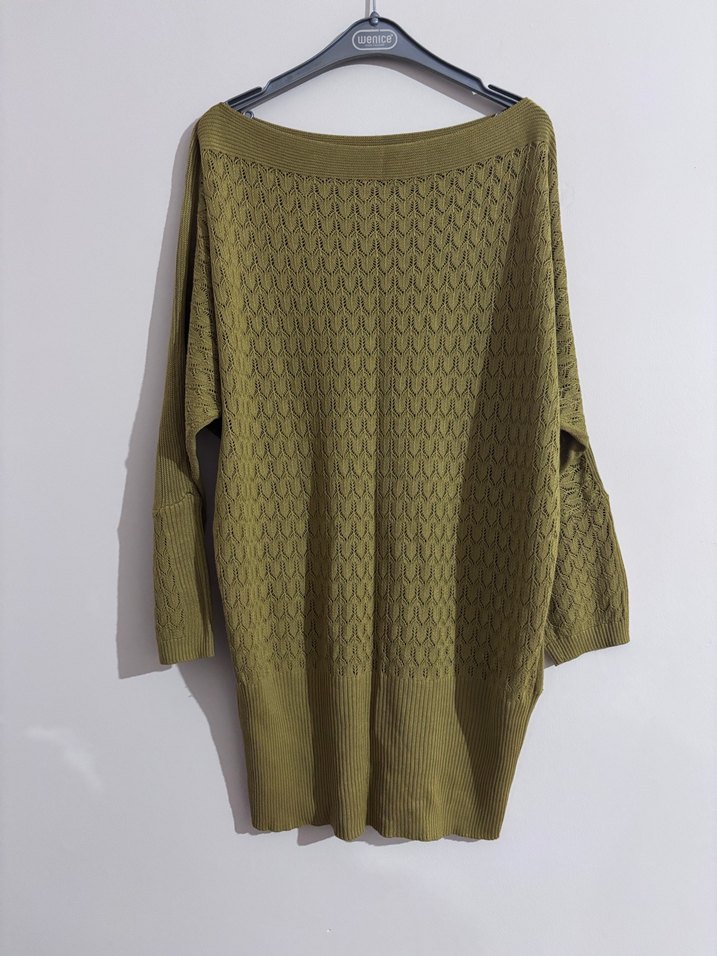 Kadın haki renkli, triko dokulu, yuvarlak yakalı, uzun kollu, bol kesim ve normal midi boyda kazak. Günlük kullanıma uygun sade tasarım. ✨ Dolabımı düzenliyorum! Kıyafetlerimin çoğu temiz, az kullanılmış ya da hiç giyilmemiştir. Kendime fazla aldıklarımı ve dolapta yer açmak istediklerimi uygun fiyata satıyorum ❤️