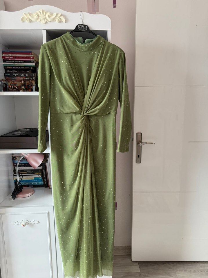 abiye elbise, yüksek yakalı ve drapeli tasarıma sahiptir. Uzun kollu, parlak dokulu ve modern klasik tarzda, sade ve şık bir görünüm sunar. Taşlı abiye