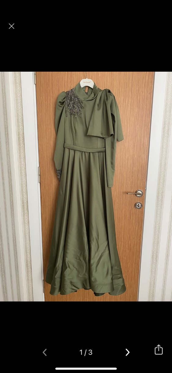 Kadınlar için haki renkli, bol kesim ve uzun kollu modern klasik tarzda uzun abiye elbise. Dökümlü tasarımı ve parlak görünümüyle düğünler için uygundur. Straplez ve desensizdir.