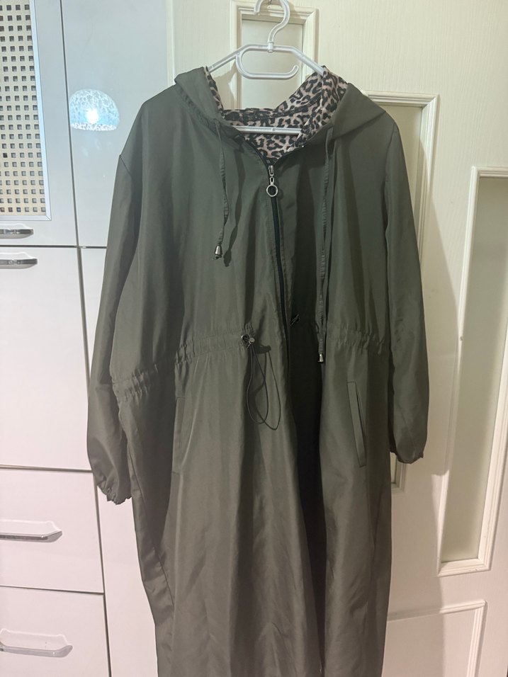 Kadınlar için haki uzun yağmurluk, bol kesim, yüksek yaka ve uzun kolludur. Belden bağlamalı, içi leopar desenli ve sentetik kumaştandır. Günlük kullanıma uygundur. ️
