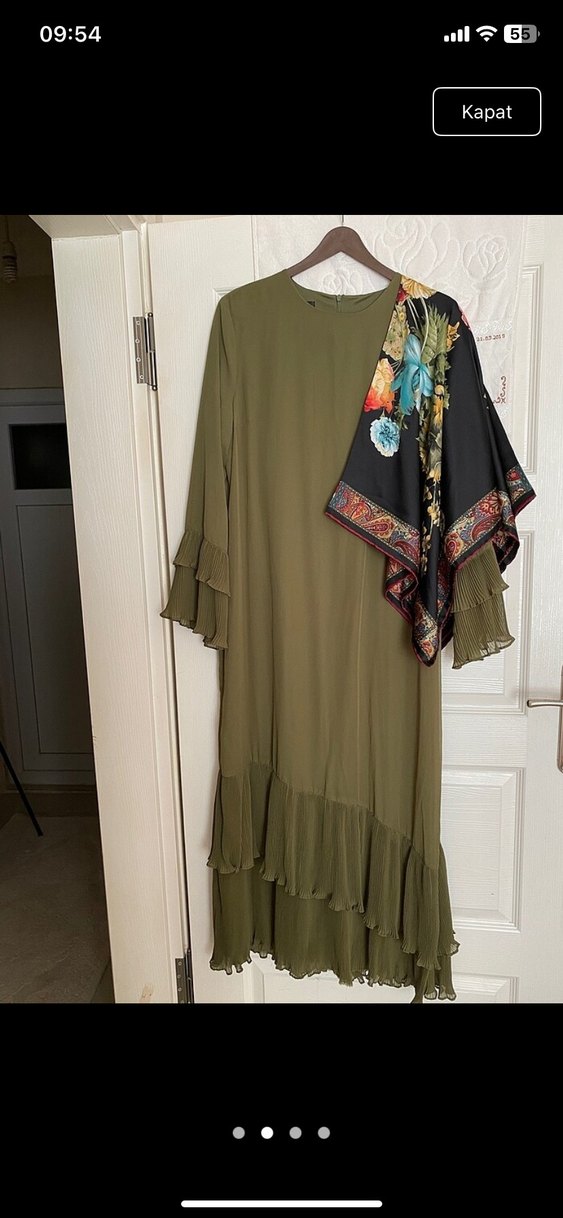 Kadın haki uzun elbise, bol kesim ve fırfırlı uzun kollara sahiptir. Sentetik kumaş, drapeli ve desenlidir, bohem tarzına uygundur. Bir kere kullandım kusursuzdur iki kol arası 49 cm boyu 135 cm eşarpla birlikte kullan ç