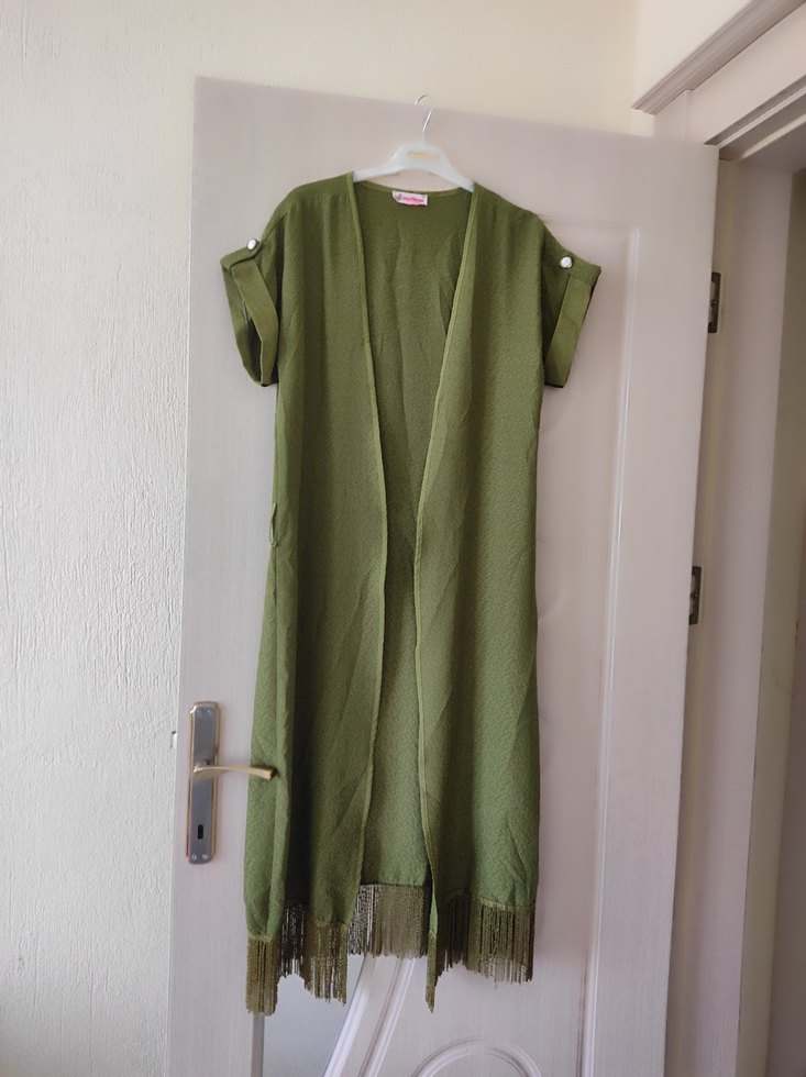Parlak haki renk, uzun boy, kolsuz, bohem tarzda kadın yelek. Salaş kesim ve minimal desen içermez.