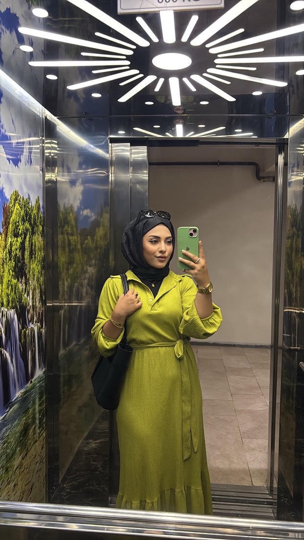 Kadın haki uzun saten elbise, yüksek yakalı ve uzun kollu. Kemer detaylı, sade ve minimal tarzda, günlük kullanıma uygun.