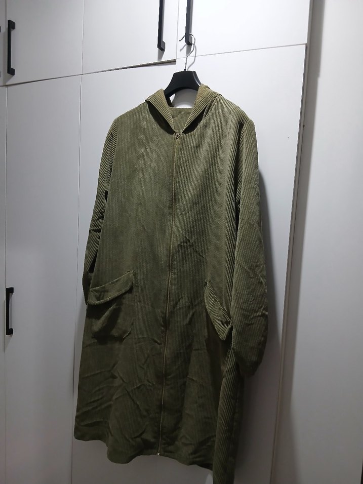 Kadın haki uzun keten kaban, fermuarlı ve cep detaylıdır. Salaş kesim, uzun kollu ve notalı yaka ile günlük sokak stiline uygundur. 102 cm uzunlugunda kolyuk altından 55 cm genıslık