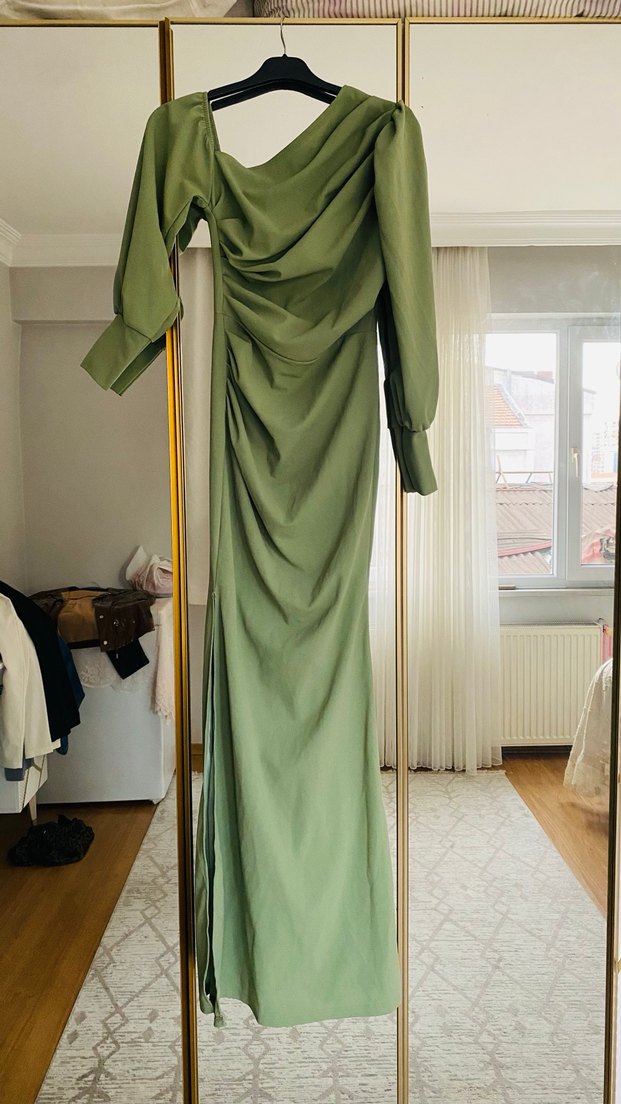 Kadın Haki Uzun Drapeli Abiye Elbise