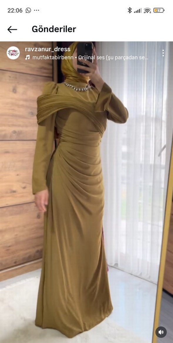 Parlak haki renkte, drapeli ve uzun kesimli, yüksek yakalı, ince askılı kollu klasik şıklıkta kadın abiye elbisesi.